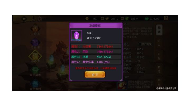 导语目前最热门的副本是五蕴秘境目前玩家最热衷的版块是天书系统目前玩家最心心念的是天书碎片和祭石目前最让人刺激和欣喜的物件也有祭石,合成随机性,熔炼8取4同样是随机,往往这种概率**件最容易激发玩家内心的“**心理”,总认为下一个祭石一定会熔炼出极品,往往事与愿违!这和我们狩猎前的幻想是一样一样的。在社区逛的时候看到“無雙诸葛亮”道友总结的祭石经验分享,书童早已说过,祭石合成和祭石熔炼大家会