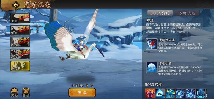 左慈一些攻击套路真的令人咋舌,冲刺撒符后,闪转腾挪又出现在挑战者身前,技能前后的辗转幅度真的是让你意想不到,追踪冰锥随机落下,扇动翅膀冰封万里,最后作为太平青领的守护者,左慈一经释放太平青领这一终极强技,那是全屏雨书大水滔天,持久强控制挑战者,只要是左慈出招,那就意味着控场,比肉眼所及的最强控场武将强上几个级别!难度五堪比炼狱,小编和好友组队,两个号加起来20多万冰攻,同样很容易被秒,狂暴形态的左慈,疯狂程度就像后台有真人操作一样,追加各种强技能,覆盖面太广了,压根不会给挑战者留有喘息之机,进一步加剧了挑战凝霜秘境的难度。