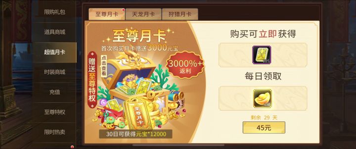 俗话说得好:买的没有卖的精!这话用在现在真的很现实:每天400元宝的超级月卡收入看似很多但实际也就是每天的正常开支,体力至少买一次60元宝,战役副本一次 30元宝,动物攻城100元宝,兵法演武场每天200元宝的花费必不可少,这样一来是不是刚好将将400元宝的收支平衡,如果遇见双倍收益,至少还要再搭进去几百元宝的开销,当然你也可以选择存起来,但是日久天长你和同行人之间的差距就显现出来了,这样一看是不