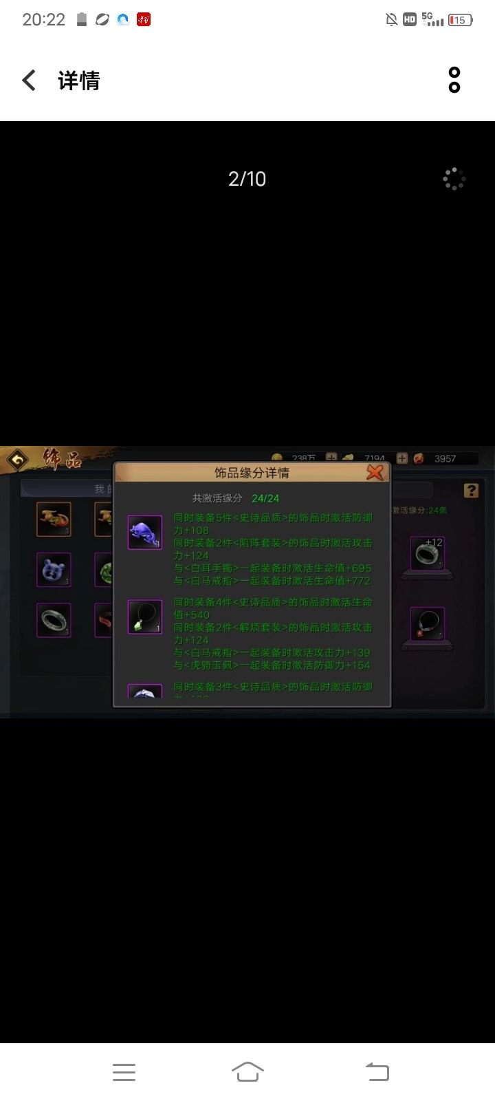 饰品作为提升属性、增涨战力的重要组成部分,同时巧搭妙配激活的缘分阁属性同样至关重要,搭配缘分能加不少战力属性,这放在初期那也是相当重要的一环。前期建议先弄一套紫色满缘分饰品作为过渡(紫色饰品主要消耗金币和精炼石,成型快),期间我们可以累积自己中意的橙色饰品,为后续替换到橙色饰品做准备。紫色饰品满缘分搭配方案:陷阵兵符+解烦项链+飞熊戒指+解烦玉佩+陷阵手镯+解烦腰带。