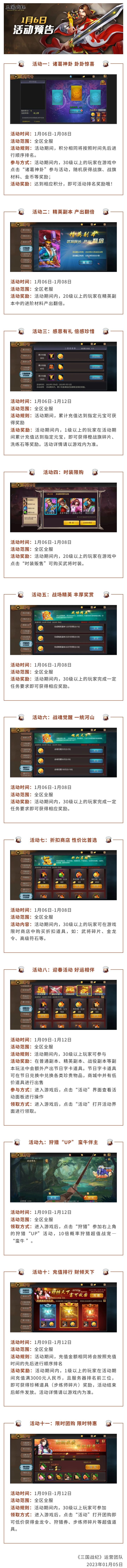 本期推荐:周年庆主题活动、天书排行榜等活动一:周年庆主题活动活动时间:6月17日-6月24日活动范围:全区全服活动规则:活动期间内,20级以上玩家可参加。活动内容:活动期间内,玩家每日登录即可获得节日大礼,完成指定任务获得丰厚奖励,更有全新武将“曹丕”限时特惠出售,同时活动商店还有各种超低折扣的道具出售哦。 活动二:“古铜书灵”狩猎“UP”活动时间:6月17日-6月20日活动范围: