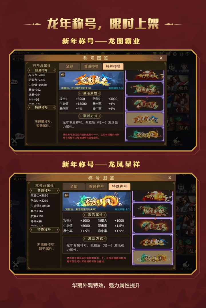 新年称号——【龙图霸业】【龙凤呈祥】春节版本限时上架!华丽外观特效,强力属性提升!
