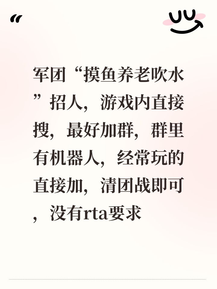 军团“摸鱼养老吹水”招人,游戏内直接搜,最好加群,群里有机器人,经常玩的直接加,清团战即可,没有rta要求