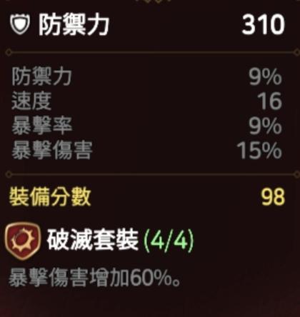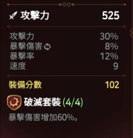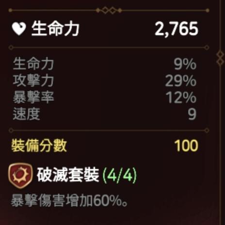 如题,萌新凑了一套破灭套。原本想给暗法的,结果发现,项链重铸的话,我这4件暗法一穿,会溢出8暴击。爆伤77,爆率90,赚13,溢出8爆率8*1.5=12,就赚一份。我还不如爆伤项链。但爆伤项链的话,我暴击率估计就很难凑了。想请教一下大佬们有什么建议。以及,大佬们的暗法是啥套装,面板是啥样子的