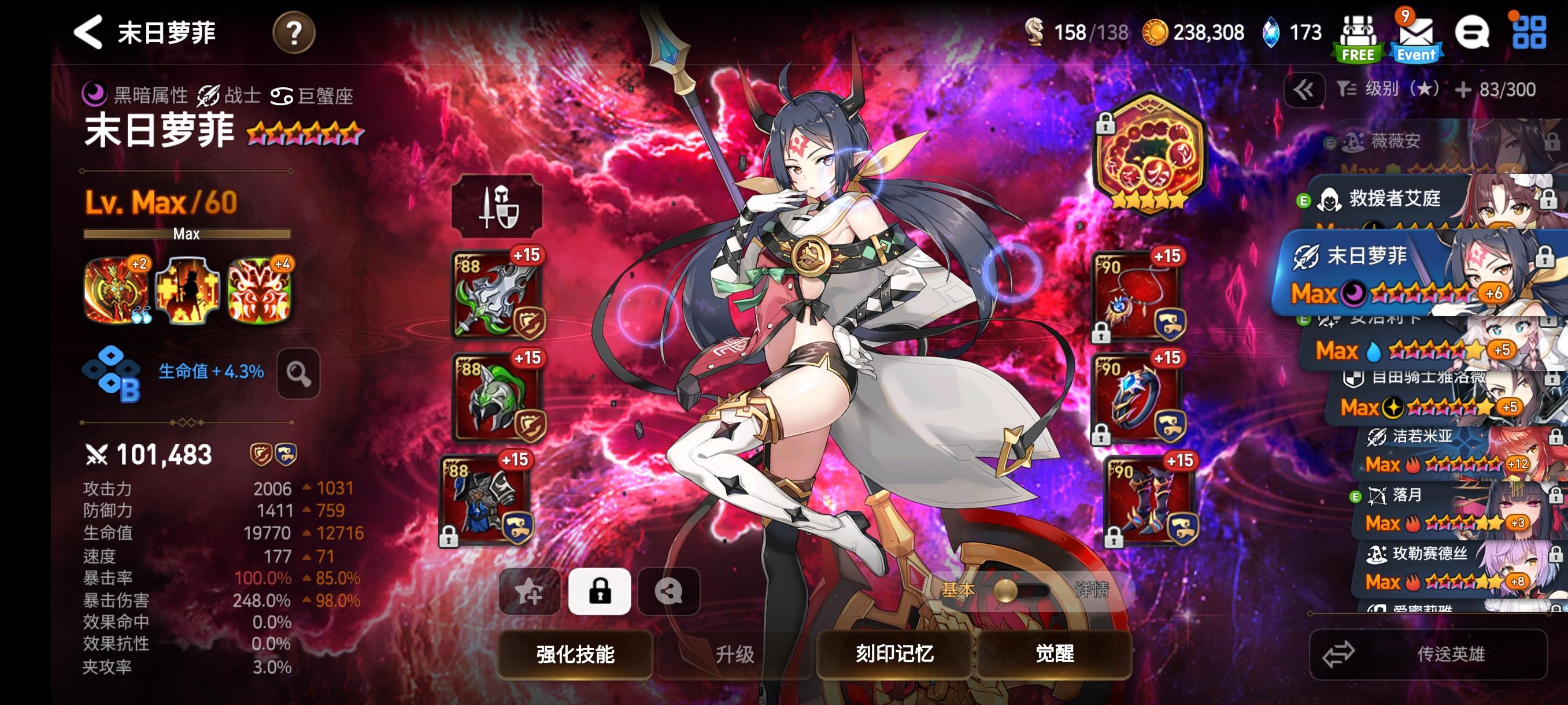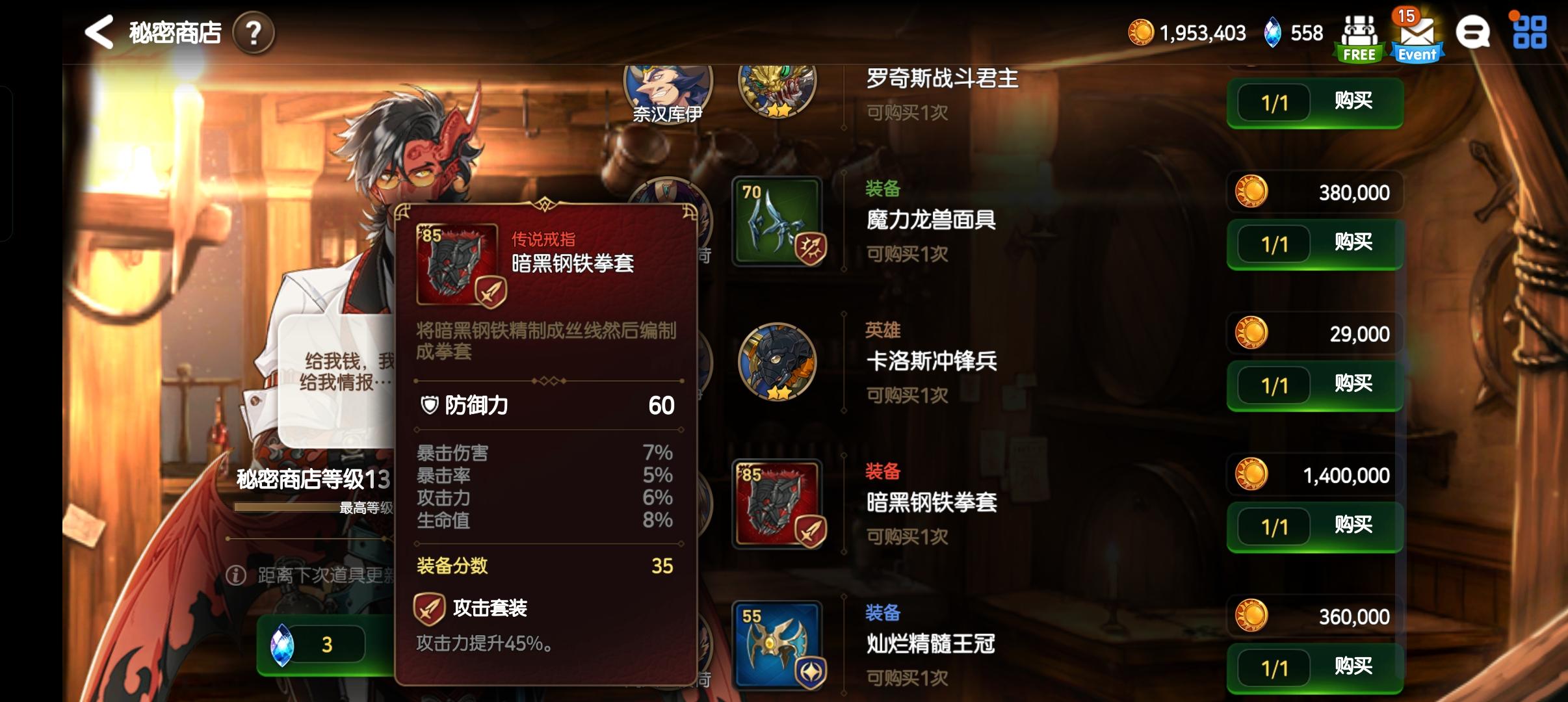 刚玩,不到一个月,网页没召唤满就换出来了,全跳命中攻击暴击,看看这个竞技场商店换的凑出来的面板算不算及格,感觉可以把武器暴击转爆伤,250爆伤没问题,神器换板甲强化了,2w血应该没问题,被动的30爆是不是已经加上面板了?