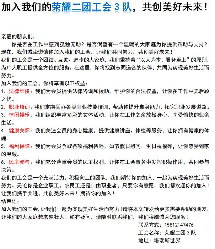 亲爱的朋友们,你是否在游戏中感到孤独无助?是否渴望有一个温暖的大家庭为你提供帮助与支持?现在,我们诚挚邀请你加入我们的工会,让我们共同努力,共创美好未来!我们的工会是一个团结、互助、进步的大家庭,我们秉持着“以人为本,服务至上”的原则,为广大职工提供全方位的服务。在这里,你将找到志同道合的伙伴,共同为实现美好生活而努力。加入我们的工会,你将享有以下权益:1. 法律维权:我们为会员提供法律咨