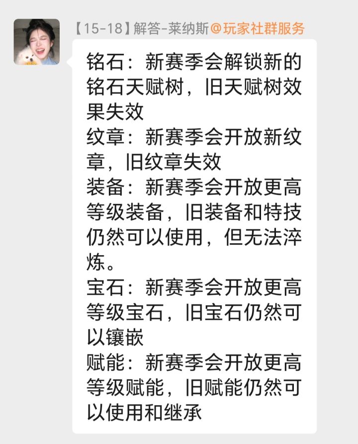 纹章本身没有质的提升,有些纹章上下左右属性强化的提升超过其自身。新赛季直接重置,如果换汤不换药,除了耽误玩家时间,消耗银币没啥意义。不能因为游戏内容少,就让玩家重复搬砖。建议是强化纹章属性,每个职业有一两个核心纹章,能与技能产生联动,甚至直接让某职业质变。比如猎人,失去召唤技能,增加一只永久存在的飞蛇宠物,可以使被攻击对象中毒,同时增加其受到的毒伤害(持续3秒,可叠加20层)。或者把某游戏的赛季