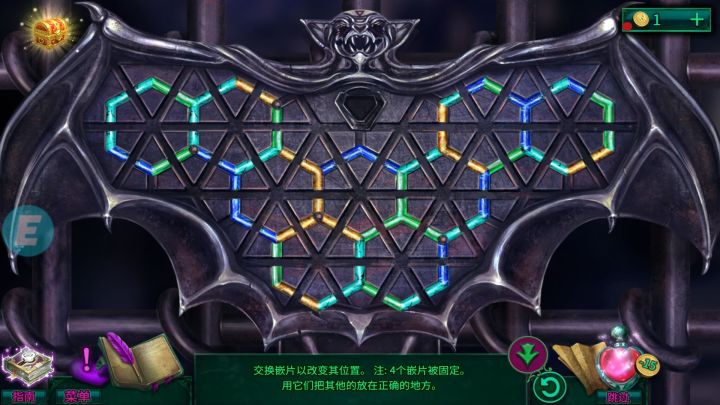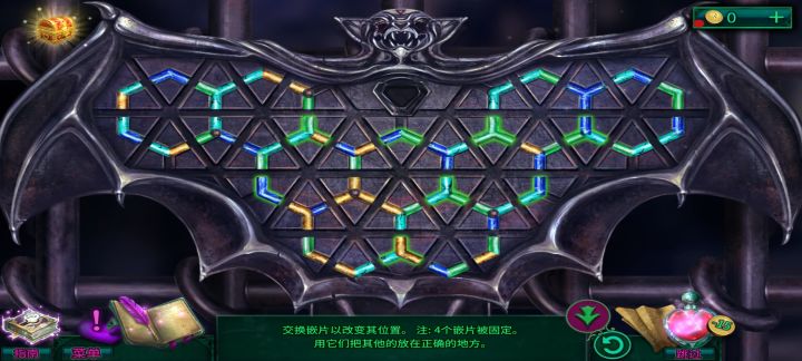 1.点击右边红色圆球,将相同的图案拖到对应的位置(如图1),烧掉左边壁龛上的蜘蛛网。12.点击右边第一个棺材,棺材中得到【剑】和一页日记。23.点击左边地上的部件,收集对应图形(如图3),得到【月亮部件】。34.点击左边壁龛,将【月亮部件】放入机关,完成月亮拼图,得到一页日记和【剪刀】,剧情结束后,再次点击这里,得到【金属蝙蝠第三部分】。4小游戏5.点击右边的棺材,使用【剪刀】,得到【织物
