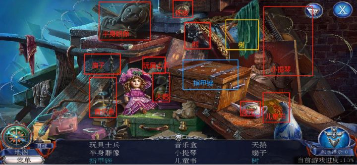 本帖是所有找东西关卡汇总,共14处,其他小游戏攻略放在另一个帖子里啦指路链接:正文开始:【001 火车站——指甲锉】注:“树”需要先扯开布,“指甲锉”需要先打开箱子【002 温室——恶魔帽子蘑菇】注:蓝色框蘑菇需要先用手套拿开玻璃,黄色框蘑菇需要先用石头打碎罐子【003 温室——色料水果】注:蓝色框需要先用手套扫开玻璃,黄色框需要先用剪刀剪掉植物【004 教堂废墟——权杖】【0