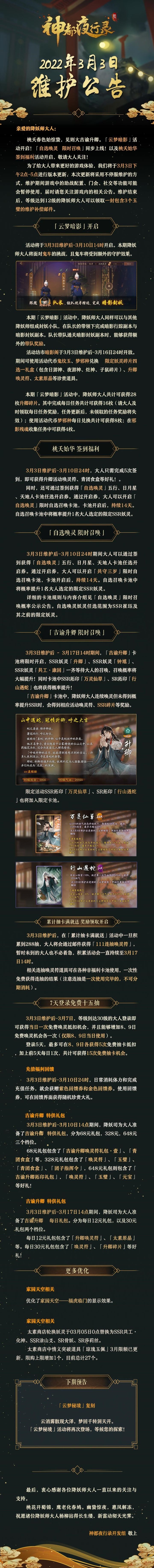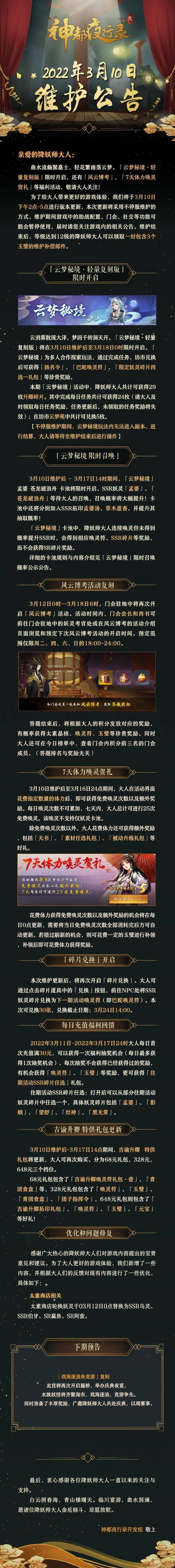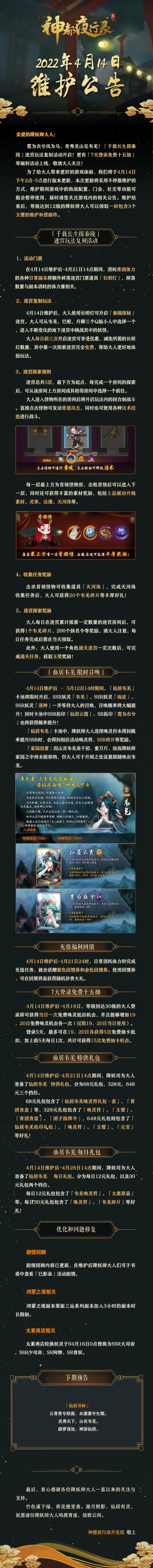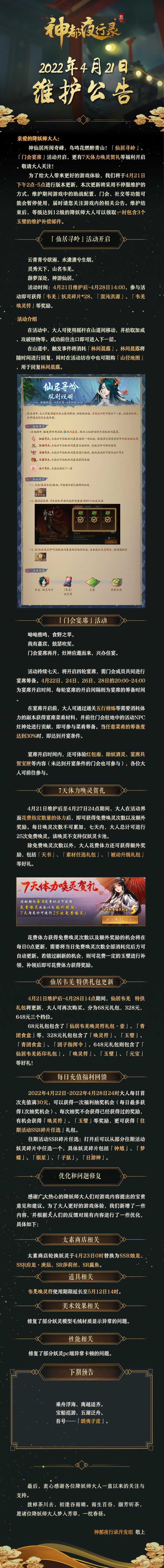 为了给大人带来更好的游戏体验,我们将于4月28日下午2点-5点进行版本更新,本次更新将采用不停服维护的方式,维护期间游戏中的助战配置、门会、社交等功能可能会暂停使用,届时请您关注游戏内的相关公告。维护结束后,等级达到12级的降妖师大人可以领取一封包含3个玉璧的维护补偿邮件。