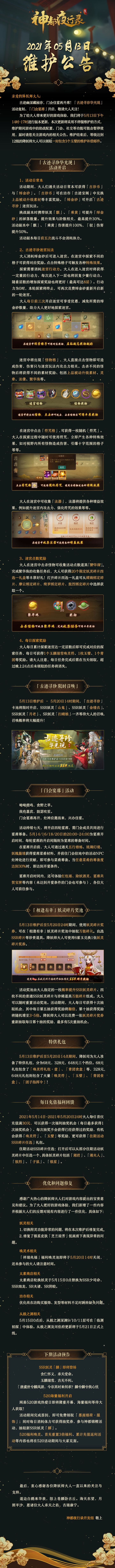 亲爱的降妖师大人:古迹幽深藏秘珍,门会佳宴再开席!「古迹寻珍华光现」活动复刻、「门会宴席」开启,敬请大人关注!为了给大人带来更好的游戏体验,我们将于5月13日下午14时-17时进行版本更新,本次更新将采用不停服维护的方式,维护期间游戏中的助战配置、门会、社交等功能可能会暂停使用,届时请您关注游戏内的相关公告。维护结束后,等级达到12级的降妖师大人可以领取一封包含3个玉璧的维护补偿邮件。最后,
