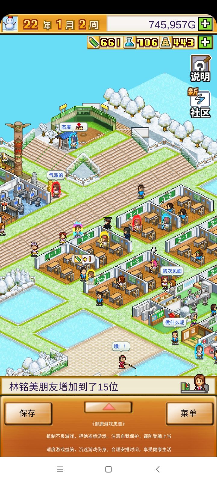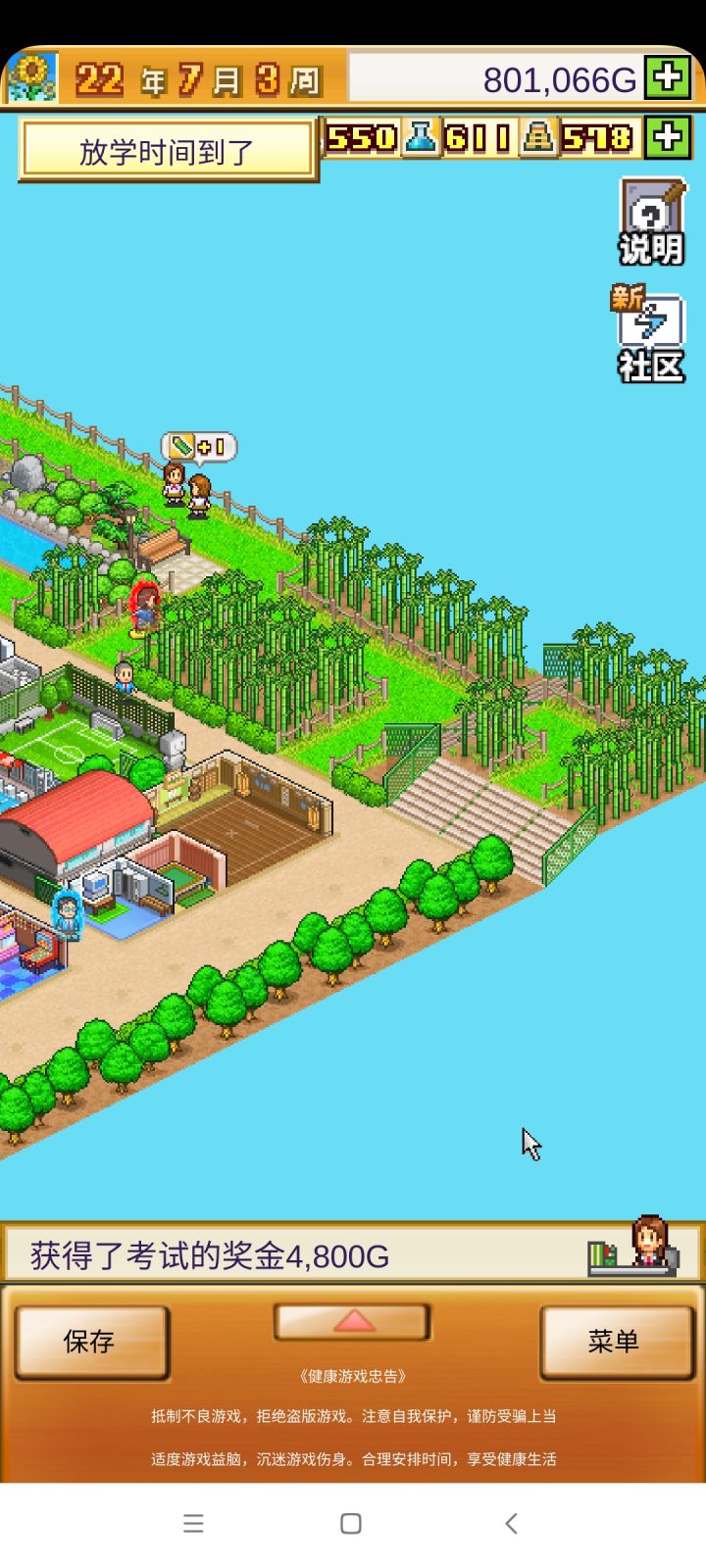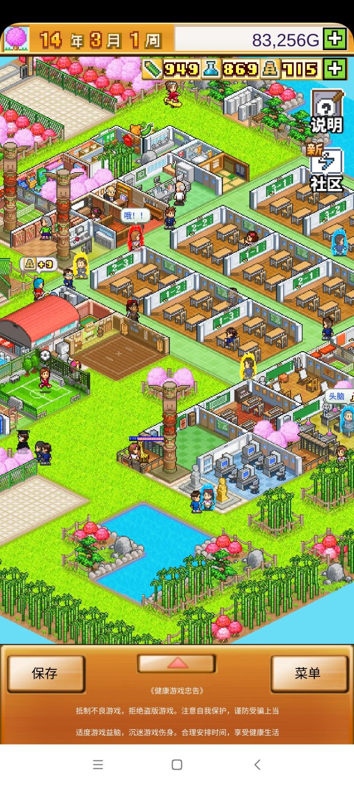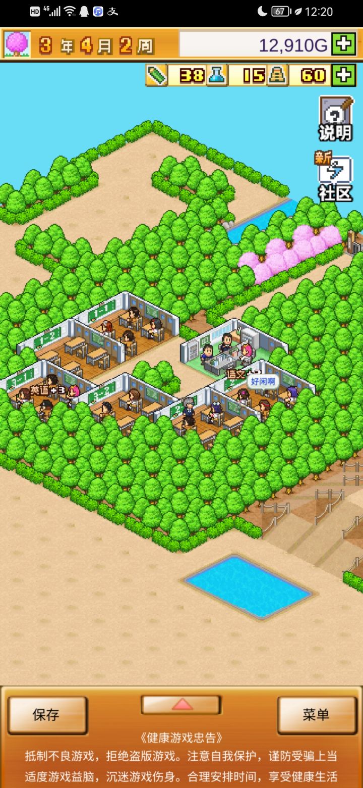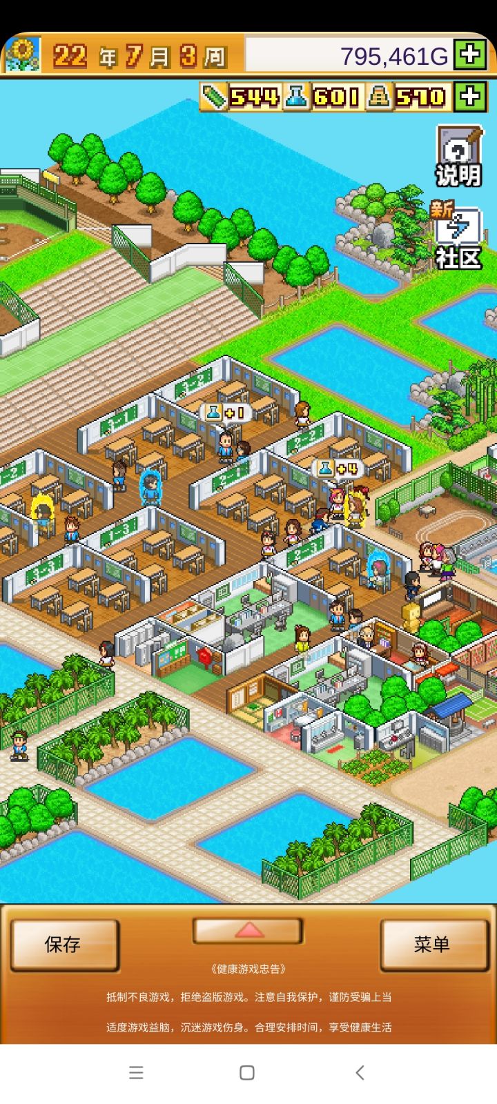 把开局设施都拆了,造下图刚好两个景点,请3个最便宜的老师种田和去小卖部消费,学生关起来自习。全程研究课题升学费。