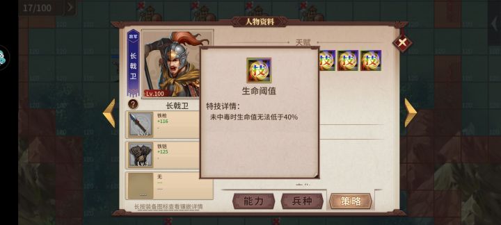 积分任务与规则:1、粮车收集物资返回主城(每个粮车完成任务250)2、完成任务剩余我军数量(500)3、旗帜剩余血量(500)4、回合数加分(15回合以内500,20回合以内400,25回合以内300,30回合以内200)旗帜被毁、粮车阵亡、全灭或被全灭结算兵种主要特技:1、初始兵:飞熊不屈减伤2w死亡加属性5次30%,龙炮车无反必中混乱,神禁无反加属性30%,妖术隐身护盾穿越致盲弱