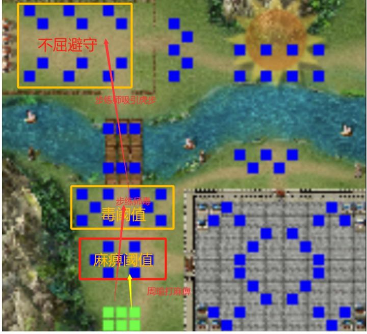1. 关卡介绍:每回合初麻痹,中毒,减速2. 敌军特技简介(除抵抗外跟国栋一样)爆伤抵抗205终伤抵抗175绝对克制150 (新增)封固伤真伤3.思路:孙尚香转骑策吹风第1回合:先开白虎,大乔小技能丢步练师(毒辅助)到第一波毒阈值大部队往左侧虎步那边走a.假如特技书伤害足够,步练师给孙尚香二动大乔丢孙尚香过去,孙尚香用万庆法连杀虎步b.丢应龙吕蒙过去,吕蒙有个白衣渡江免疫混乱(吕