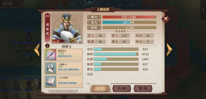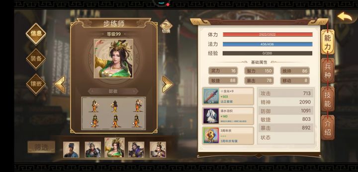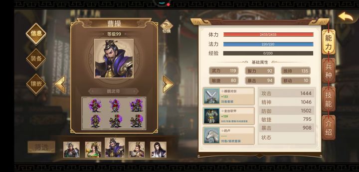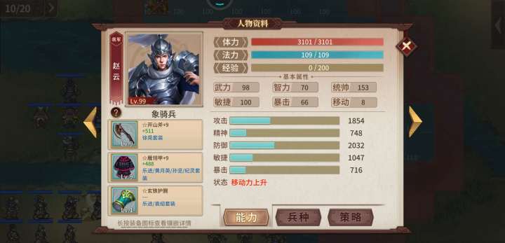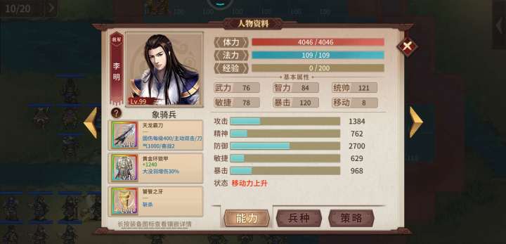 1. 李明,霸刀,黄金甲,牙齿+2 曹操魂。 主力输出,打有名字的武将和无名弓手,躲开法师和无反击属性骑兵。