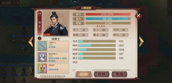 4.法正,清水衣服,二周年。给回归,加闪,操控敌军位置,方便李明清兵。