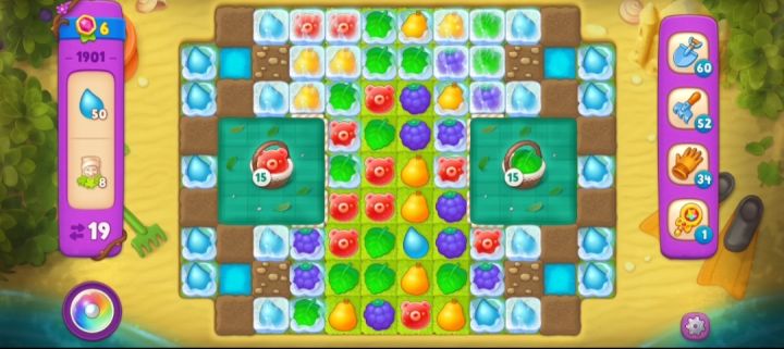 关卡目标 小矮人×8、💧×50关卡步数 19关卡特殊元素 土块、草地、野餐布、冰层关卡难度 超高难度特殊元素消除方法冰层:匹配与冰层里元素相同的元素或者炸弹炸开,冰层的消除次数取决于冰层的厚度。草地:草地需要在草地上进行元素消除,完全消除次数根据草地厚度来定。土块:在土块旁边元素匹配可以消除土块,土块消除次数由石子的多少决定的。野餐布:收集与野餐布篮子上相同种类以及数量的元素,可以
