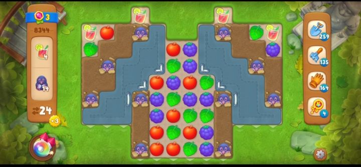关卡目标 柠檬水×4、地鼠×14关卡步数 24关卡特殊元素 帆布、土块关卡难度 普通特殊元素消除方法帆布:在帆布周围进行元素匹配,当帆布上的白线全部去除干净,帆布即可消失。土块:土块的消除需要在土块周围消除普通元素或者炸弹炸开,完全清除次数根据土块厚度来定。关卡过关技巧①先观察一下开局,这一关一共是24步,过关目标是柠檬水和地鼠。②先在帆布的白线旁边元素匹配清除帆布上的白线,帆布