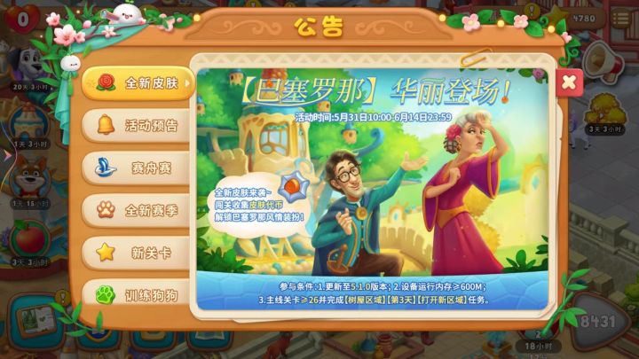 一、 关于活动时间&参与条件1、 活动时间:5月31日10:00—6月14日23:592、 参与条件:(1)花园更新至5.1.0版本(2) 设备运行内存≥600M(3) 主线关卡≥26关并完成【树屋区域】【第3天】【打开新区域】任务二、 关于彩陶(皮肤代币)1、 成功闯关获得彩陶,即可参加活动2、 成功闯过普通关卡获得65个彩陶,高难度关卡75个彩陶,超高难度关卡90个彩陶3、 总共需要三万四