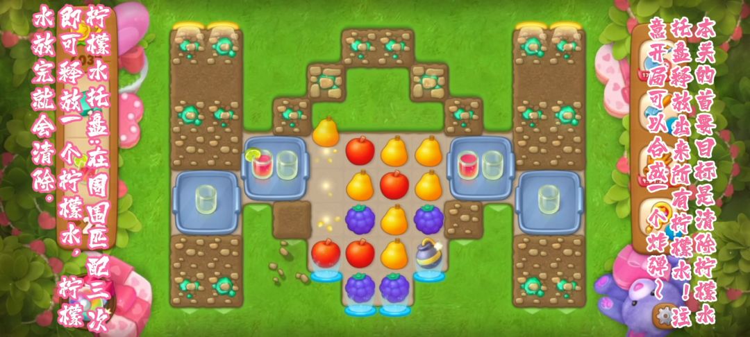 关卡介绍关卡目标:翡翠、柠檬水关卡步数:28关卡特殊元素:翡翠、柠檬水托盘、土块关卡难度:普通 关卡攻略1、特殊元素消除方法:翡翠:匹配翡翠旁边的元素来收集它们。收集所有的翡翠来达成收集目标。柠檬水托盘:在周围匹配三次即可释放一个柠檬水,柠檬水放完就会清除。土块:匹配土块旁边的元素来清除它们。2、通关技巧:①观察全局:本关的收集目标柠檬水需要在柠檬水托盘附近匹配才能得到,并且