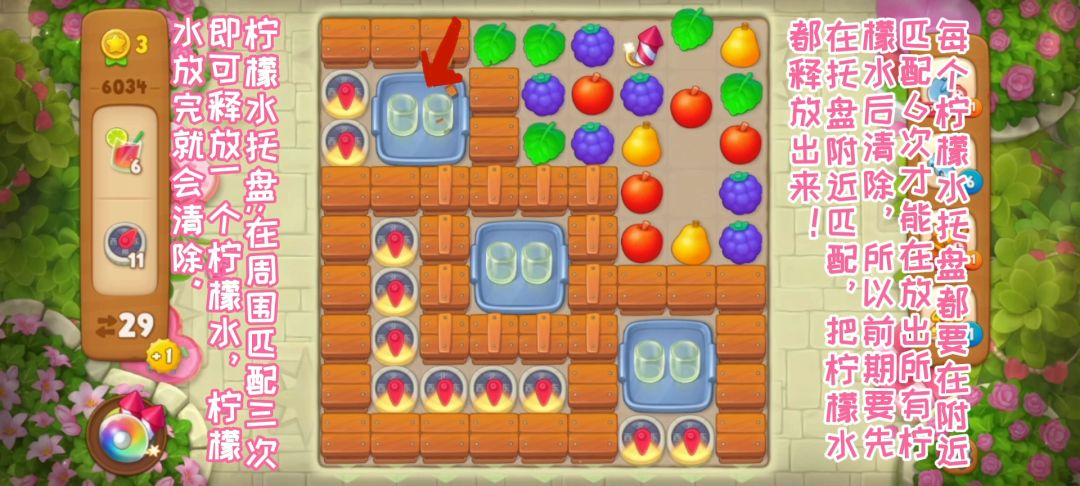 关卡介绍关卡目标:柠檬水、指南针关卡步数:30关卡特殊元素:柠檬水托盘、指南针、箱子关卡难度:普通 关卡攻略1、特殊元素消除方法:柠檬水托盘:在周围匹配三次即可释放一个柠檬水,柠檬水放完就会清除。指南针:在指针方向匹配即可清除,每次移动未消除的指南针都会更改方向。箱子:在箱子周围匹配来清除它们。2、通关技巧:①观察开局:如上图收集目标柠檬水是放在柠檬水托盘内,每个托盘都要在附