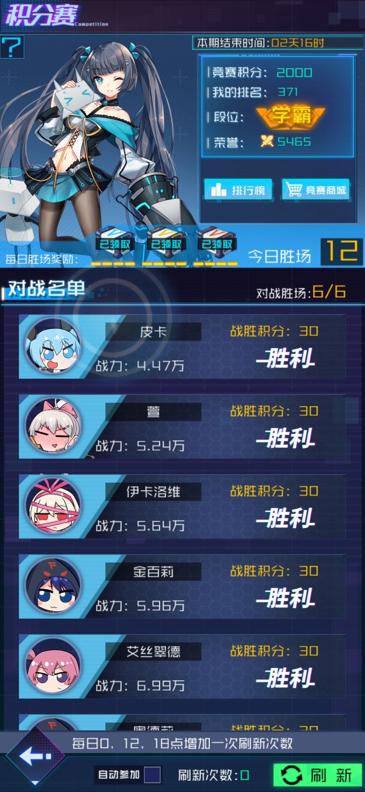 一个建议。。自动挑战初衷是好的,休闲减负,但实际感觉鸡肋,所以为啥不直接开快速挑战,应该没有人积分赛打不过吧,或者打赢最下面的两场,然后其它四场可以快速挑战也行。。