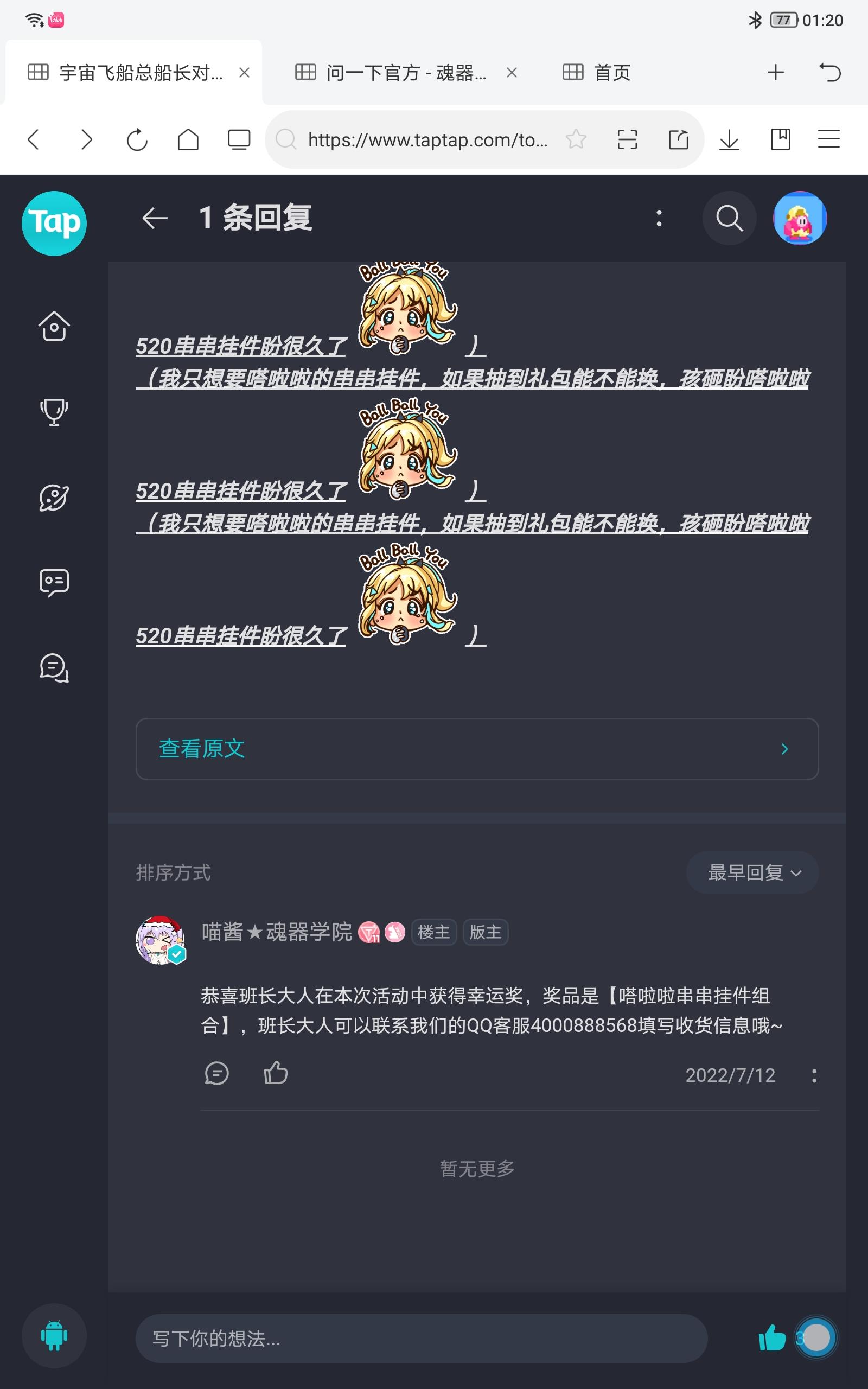 在这个活动里得到了嗒啦啦钥匙挂件↓但是开奖完已经有两周了,地址信息我也很早就去找客服提交了但是我到现在都没收到奖品发货的消息,我问客服也一直不鸟我,跑来论坛来问问到底是什么情况