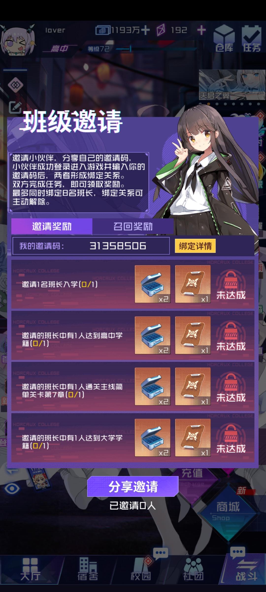 刚刚玩的萌新有邀请码没填的吗,过了初中就填不了,我就是因为不知道这个规则亏了20张左右卷。本人官服二区31357193邀请码/召唤码,一起领奖励。