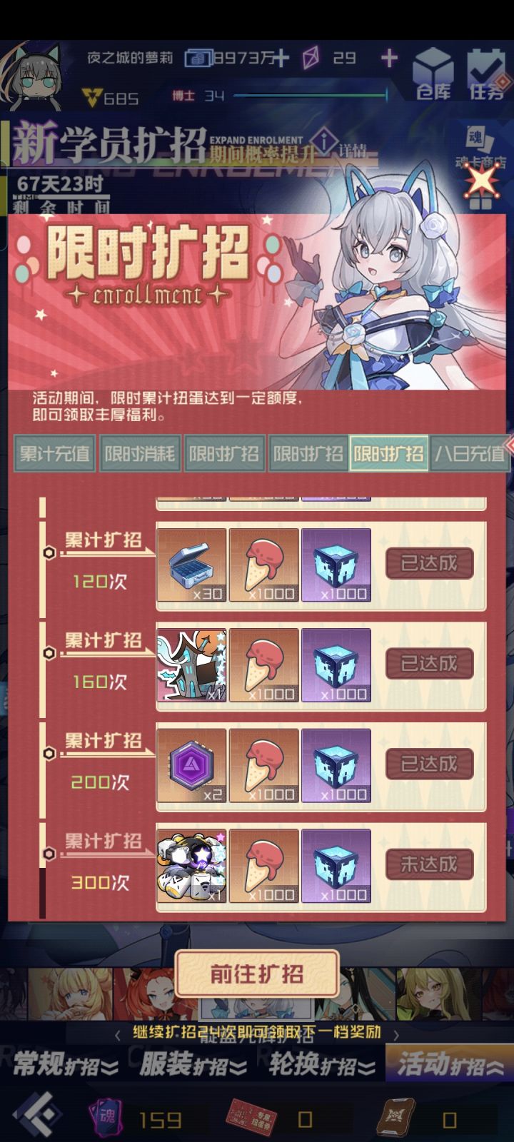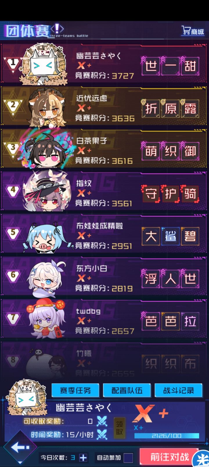 天启姬诺娃时代入坑2023.11;2024.2;2024.3三次团体第一很多高配号不玩团体或不买次数,给了我三次拿第一的机会。累计氪金996元,除了两根烟花棒,和孔雀、指挥棒、橘豹、巧猫等可用共轭碎片复制的魂器没有其他新的高质量氪金魂器。在打团体的人里也有人配置比我高,但这个游戏是背刺游戏,游戏模式给了人以弱胜强的机会和成就感,所以我很喜欢团体赛。用心我相信我是在前列的,学习lilyf