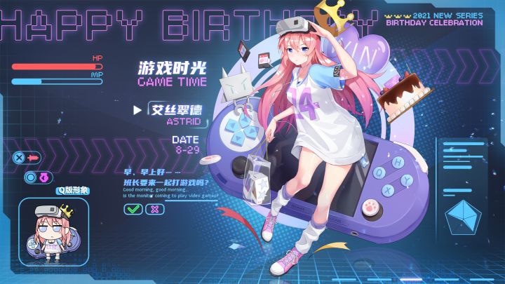 亲爱的班长大人~今天是是8月29日,是艾丝翠德的生日!班长大人有没有准备好生日礼物呢~——早、早上好……班长要来一起打游戏吗——最新出版的卡带已经准备好了哟,今天的目标就是通关!Game Time生日皮肤-游戏时光Q版形象艾丝翠德的生日蛋糕已经准备好了!今天的班长大人可逃不掉哦,吃完蛋糕后一起来打游戏吧!生日福利在评论区留言的班长大人,喵酱会和艾丝翠德一起随机抽取两位送出扭蛋券*1