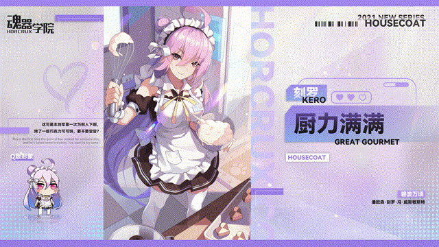 亲爱的班长大人~刻罗将军即将来到学院加入学院大家庭了,既然加入了学院,自然也要让班长大人看到和在海军时候不一样的面貌!碧波万顷-刻罗新皮肤“厨力满满”将通过新学员支援获得~围裙?女仆装?厨娘?威风赫赫的将军大人居然也有这一面吗?新皮肤-厨力满满哦?乖仔也被本将军的魅力迷倒了吗?不过你可要小心一点,”偷心的猎手“可不会负责哦?Q版形象——嗯嗯,还算紧跟潮流的设计,就是再来颗袖扣就好了。