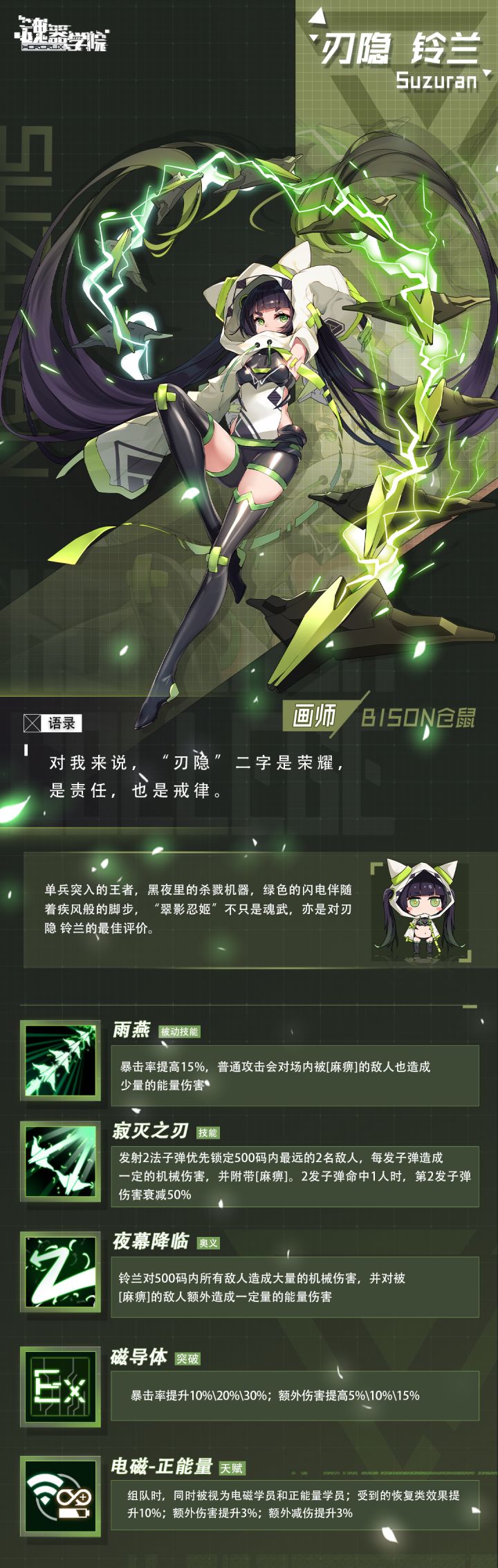 亲爱的班长大人~"刃影"是与"风魔"同源的忍者世家,但是与逐渐没落的风魔家不同,刃隐家活跃于世界的暗处,他们乐于接纳新兴科技,精通最先进武器与技术,同时还保留着忍者的冷酷手段与超人体能,这让刃隐一族成为世界著名的暗杀集团,势力庞大,渗入全球各地。而刃隐家当代家主的女儿,便是刃隐 铃兰。在得知风魔胧进入魂器学院后实力获得巨大提升,刃隐家也安排铃兰进入学院进修。铃兰上线后每位班长大人都会获得【扭