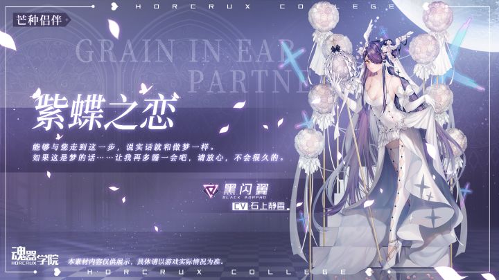 亲爱的班长大人~虽然才入学不久,信息成迷却实力超强,像影子一样陪伴着班长大人的黑闪翼,也即将换上誓约的礼服啦~沉着冷静的她换上了洁白的礼服缓步而来,羽翼和鲜花变为独特的饰品映衬出少女翠色的眼眸。环绕的花苞在等待着开放,此刻正是花蕾绽放之时。换上誓约礼服【紫蝶之恋】的黑闪翼在等待着班长大人的到来,快带着黑闪翼从黑暗中走到阳光下来吧!——就算是我这样的人也无所谓吗?就算我这样的人也可以吗?—