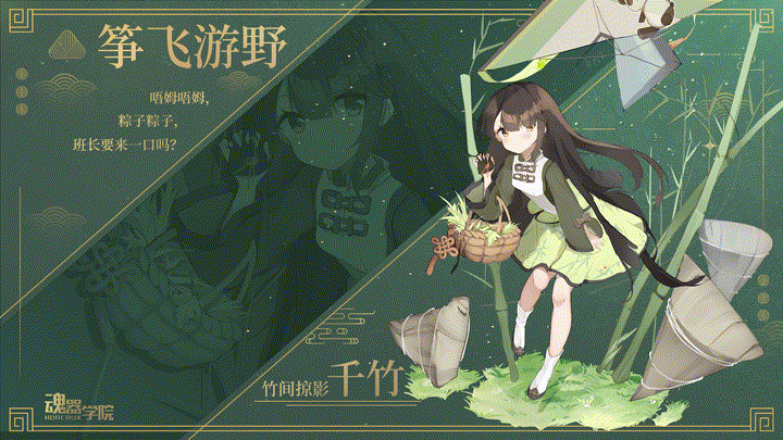 亲爱的班长大人~正值端午佳节,学院里又有两位换上了节日服饰的学员啦~天气正好!千竹准备了好大一只的风筝想邀请班长大人一起去玩呀!风筝上印着团子!是要把团子送到天上飞起来吗?!班长大人问千竹手里的篮子是干什么的?班长,竹林里怎么会长出粽子呢!篮子里当然是千竹准备的粽子和香草!来,分给班长吧(〃'▽'〃)——千竹【筝飞游野】唔姆唔姆,粽子粽子,班长要来一口吗?千竹换上了端午节日服饰【筝