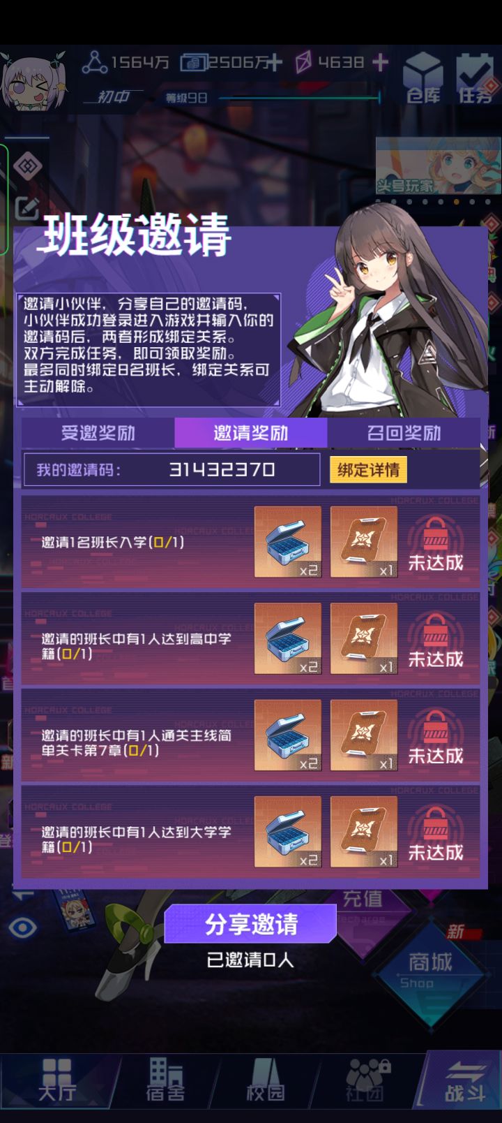 二区邀请码:31426767 萌新欢迎填写,不用想着互填,因为邀请码会看等级的,只能填等级比你高的邀请码