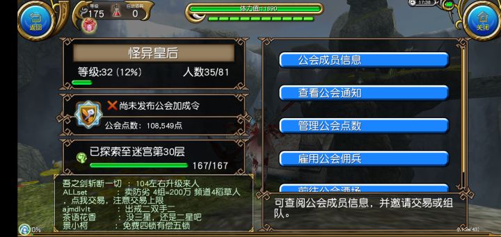 这个公会想必大家完全没听说过(明明都创了4,5个月了QSQ,总人数就没超过50人)我本人很佛系的,拉人入会都是随缘,偶尔在世界上喊一喊,看见世界上有人求公会就拉一个,所以公会人少,才30多人(我一直怀疑是不是口号不对…)我觉得我要是在不拉人,恐怕公会满级了,人数都没满(别看有30多人其实,实际人数要更少些)公会的有不少脱机一个月的人,我不踢是因为舍不得QAQ,总觉得他们总有一天会上线(前天