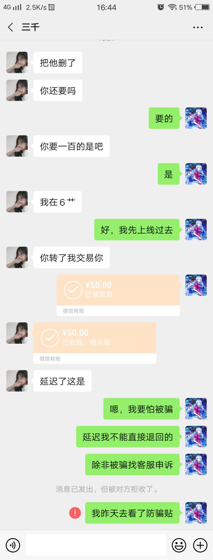 1天内挂2个人好像也只有我这个笨蛋吧微信号对就是这样,我在思考什么时候游戏范围变成了这样,这是我玩这一款游戏到现在进行线下交易没有20次也有十几次了,就这连续2次被骗是我太傻,还是说我对同玩这一款游戏的玩家没有防备,我比较好奇,我并不是什么富豪但是我对游戏的一些支持还是有的,像王者买几个皮肤(这里打个比方)在我有一定资金的情况下月卡我会开着当然我知道这都不算什么。但是连续2次被骗让我感觉不舒