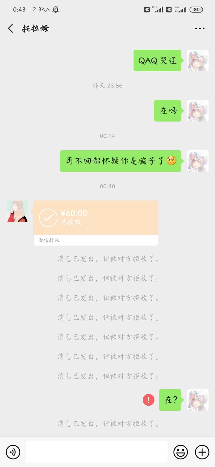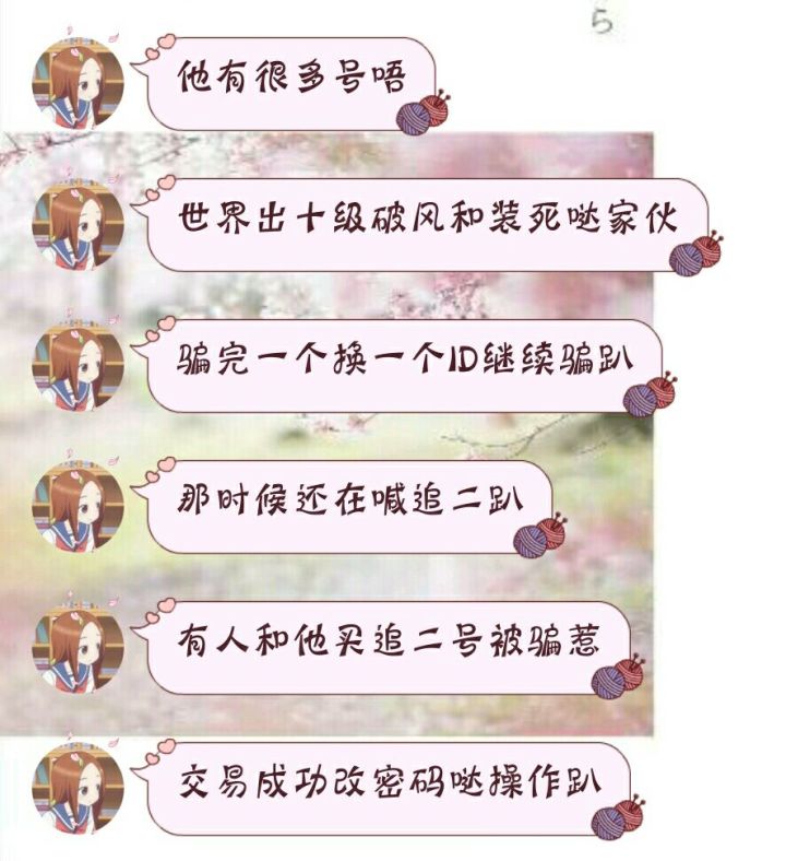 首先这件事情是从朋友那边听说的..聊天截图如下事情原委是我那个朋友在买星石..然后遇到了这个骗子..(揉一会)事情已经这样了..自然知道东西不可回来这个人账号很多的样子,骗完一个换一个号继续骗。但是账号在怎么会换..语气也是看得出来的(或者欲纵故擒的手法)因此..通过刚刚截图记住这样子的说话语气,然后以后多提防乱码的英文名..(skauihsy这种..不是指那次英文名|ω・))
