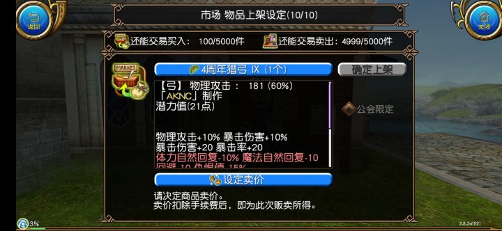 约摸估计着是今天凌晨的时候 我碰到了一件让我有理说不出的事情 本来想着不去想它 退一步海阔天空嘛 但是我就越想越气 所以来发篇贴子事情经过是这样 我之前眼瓢 以8888万的价格在板子上买了一件9a衣服 但是只有10暴击伤害发现之后我就换了一件10a衣 这件衣服就一直丢给我朋友在用 昨天他把衣服还给我之后我就顺手挂了3888万在板子上 过了凌晨之后我发现衣服卖出去了 然后我就在世界说了一声衣服卖了