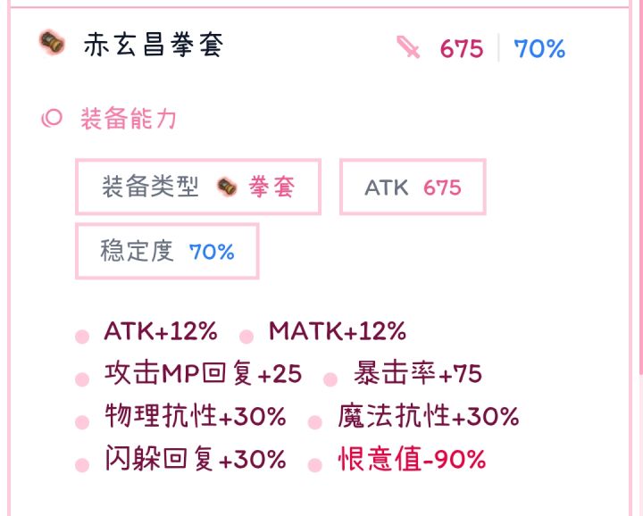 ✰主手武器赤玄昌当前版本最好的拳,唯一缺点就是难开。鲑鱼拳手头有并且不想换就用狂爪真有人还在用这个?9周年对属拳伤害和赤拳差距无几,缺少的攻回劣势也被短兵弥补了,在本打法里和赤拳并列为最优选主手✰副手小刀首先保证攻击>=300,保证暗影步倍率到最大再考虑有用属性战律短剑属性不错的同时,365的底攻对于短兵也有一点提升樱树短剑一般吧,不过马上到赏樱活动了,防止有的人错过