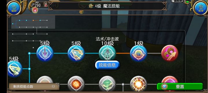 法术/冲击波(必点7,选点10)非常好用的输出技能起手,200蓝,让下一个技能蓝耗减半,7级时无咏唱时间 此技能有50~65%的概率(7级~10级),对怪物造成翻覆,算是提供一个不稳定的控制 法术/终结(必点1)用于结尾增幅断连,抵消连击效果中的一些负面效果