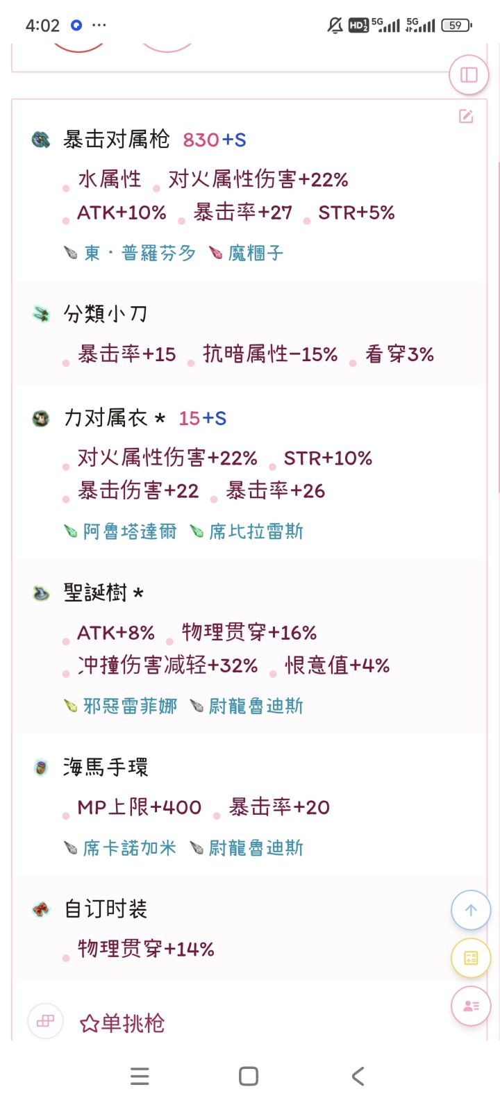 主力副敏不多说🍎自己家需要7级以上MP料理装备六周年对属武器 暴击要23通用枪要10力3%爆伤的强烈建议圣诞节王掉冰灵枪 相当给力王石 炎龙魔团子衣服8a衣 对属也行 轻化 要24暴击率王石 加龟朱樱帽子有俩圣诞树 糖精2戈尔多信封帽 邪雷戈尔多平时用信封+冰灵枪 攻速在无神速9700很舒服圣诞树+对属周年 单神速正好万速戒指烂漫 龙伏塔图 穿越也行小刀 封翻神圣 抗