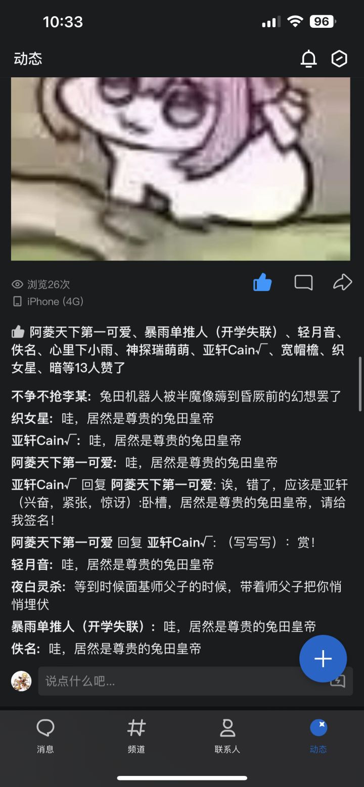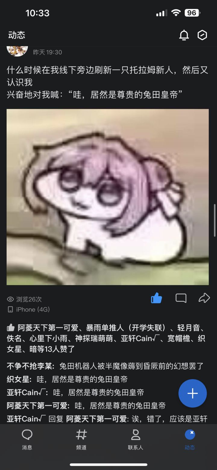 卧槽(惊讶),你也玩托拉姆吗(高兴),你的id是什么呀(好奇)?哇(眼睛放光),你居然就是尊贵的兔田皇帝大人(兴奋)——