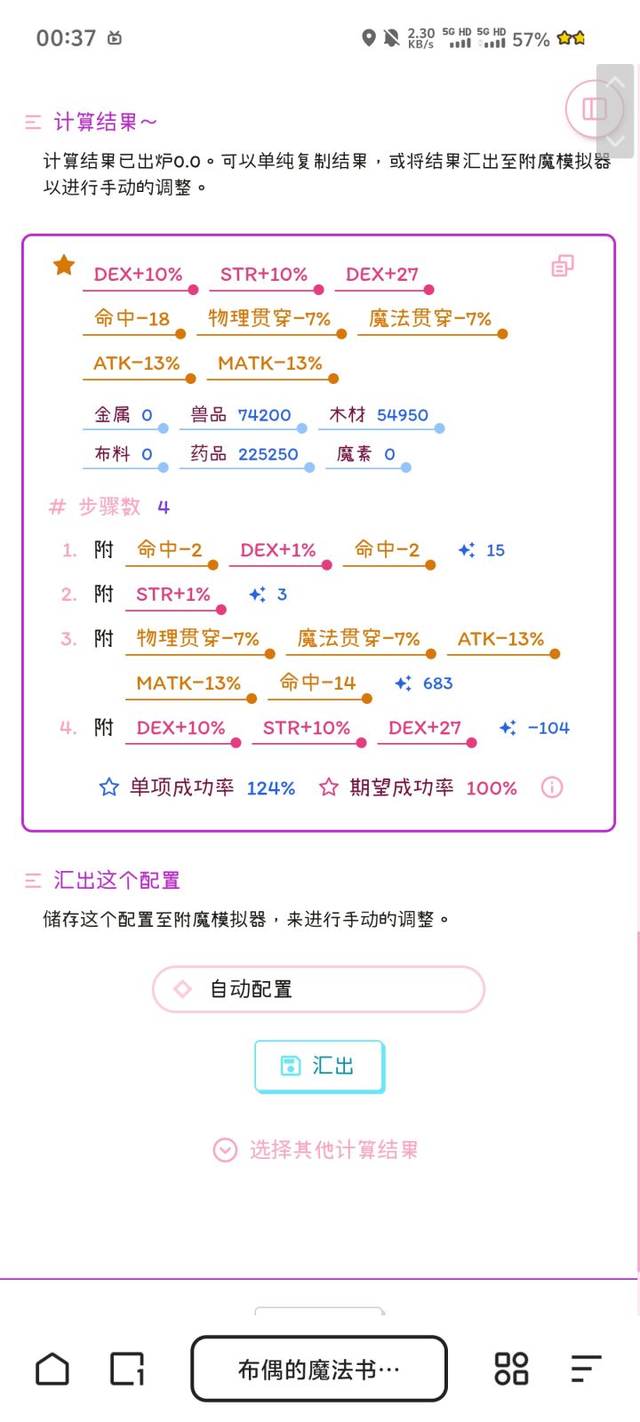 ✩ 身体防具装备初始潜力值|1基础锻造熟练度|0✩ 最终结果DEX+10%|STR+10%|DEX+27|命中-6%|物理贯穿-7%|魔法贯穿-7%|ATK-10%|MATK-11%✩ 素材耗量金属 0|兽品 52500|木材 39300|布料 0|药品 201600|魔素 0步骤数|41. 附DEX+1%|命中-2%|15pt2. 附STR+1%|3pt3. 附物理贯穿-7%