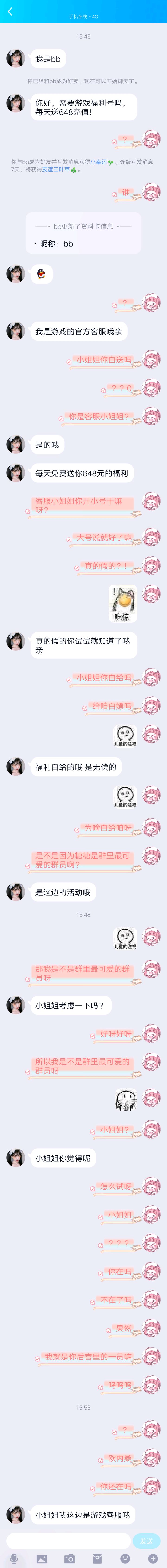 官群里突然收到了好友申请,一看,诶,挺漂亮的小姐姐(一看就是见过的网图),没想到还挺好玩,聊天记录如下在删我之前我只是以为这是个骗子,🌚还玩的挺开心还以为它推过来的应该也是机器人或者骗子,就开始阴阳怪气的某糖骂我了!骂我了!(我才不是m)看来不是个骗子,是个正常人就迷惑(又水了一个帖子√)