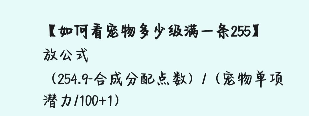 【宠物能力加点】 首先,宠物能力数值加点和人机制不同 人物能力数值最多255一项,而宠物可以大于255。具体分为手动加点和按潜力分配的自动加点。 手动加点是宠物每次升级或者合成给的,每次升级给的强化点数和人升级分配强化点数一样。手动加点在能力数值到达255后无法加点,所以宠物能力数值单项高于255后只有按潜力分配的自动加点。 按潜力分配的自动加点是按照(每次升级时能力数值+潜力/100)这