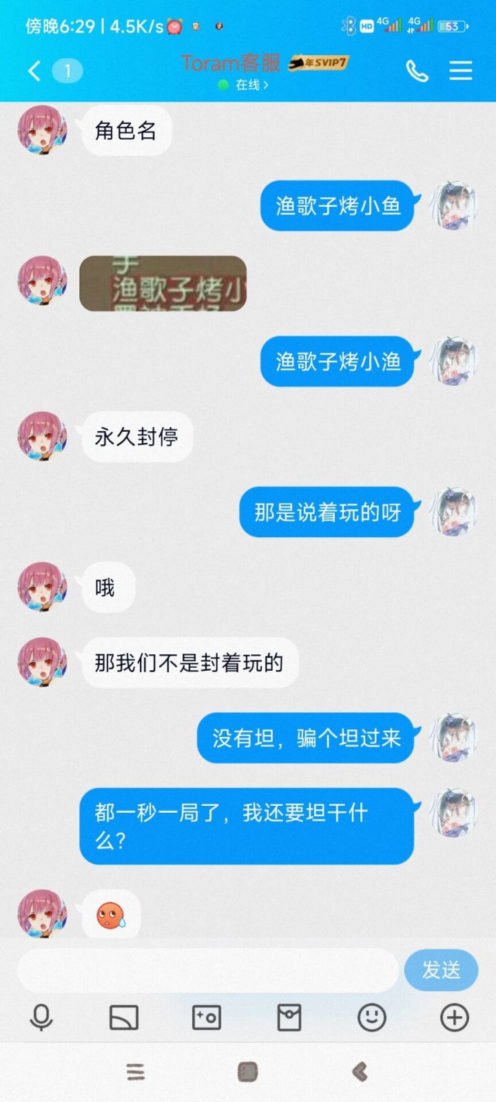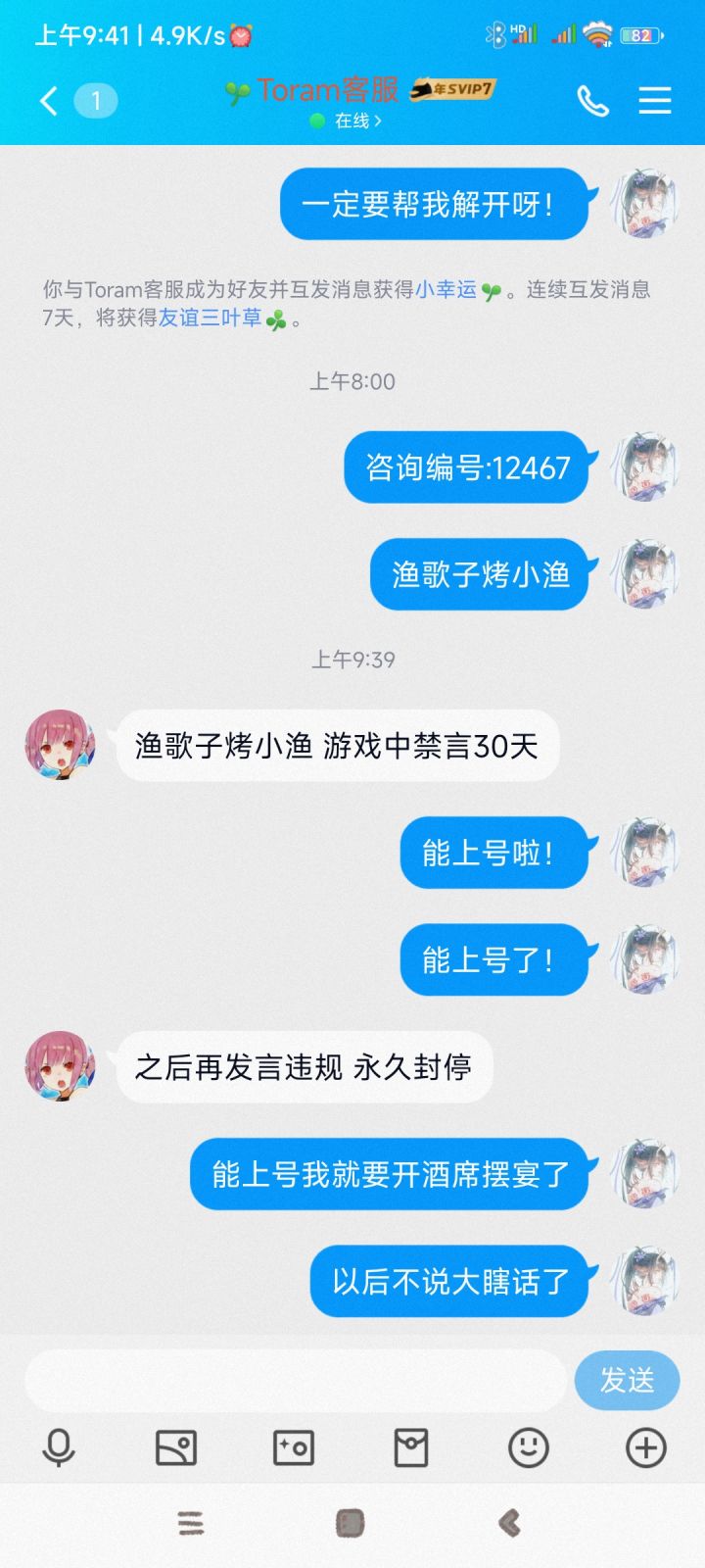 小游,我要上号,今天刚把匠练好,才敲了四把弓,就给我封了。看到鸭鸭帮我给他告声别,替我转告他最后一句话,“绝味鸭脖”(இωஇ )后续第二天早上解封了,禁言30天。