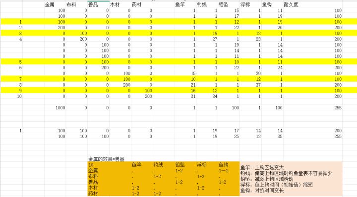 根据鱼竿的属性,个人感觉鱼竿的上钩区域变大与铅坠的减少区域滑动为最主要的属性,而钓线的偏离上钩区域变少的属性不是很有用,于是再给出一个特化方案。