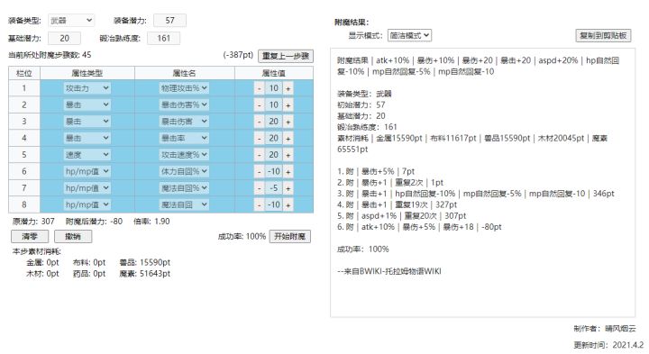 原来的帖子被吃了,链接也发不了,只能把被吃的帖子放这里,曲线救国了。附魔计算器的链接也在这里面,只能在论坛里面打开。。-------------------------下面是那个帖子的文字内容,再复制放一份到这:这两星期的空余时间,我在b站的BWIKI做了一个200版本附魔模拟器。这次的这个和我之前用C语言编的不一样,这个是真正放在网上的,所以是真正可以用的。这个是我今天才编好的,再加上我
