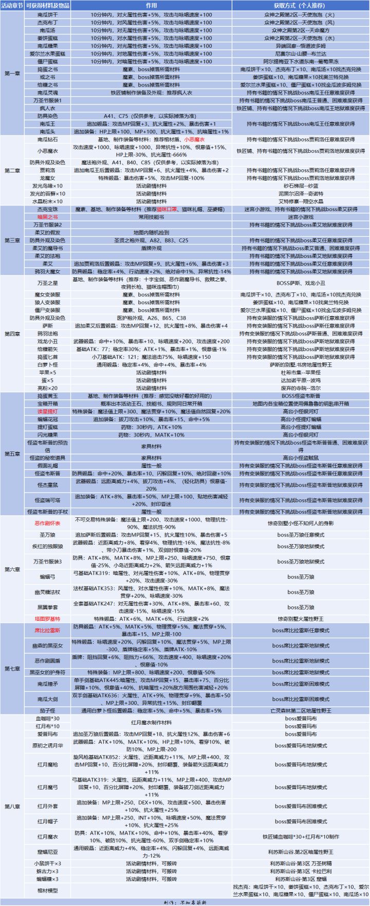 万圣节搬砖指数:★★★★★作为一年之中比较大、时间比较长的活动,万圣节活动持续时间1个月左右,可以搬的东西比较多,在这个期间入坑的新人有福啦!其中最简单、适合萌新的当属第三章,迷宫小游戏,对等级、装备均无要求(路痴慎入),可搬暗黑之书、杰克宝珠。一、各章节掉落物品一览Tips:剧情所需日常材料建议在活动前搬,列举如下:第二章剧情材料: 发光鸟喙×10、 发光的苔藓×10、 水晶粉末×1